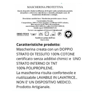 Mascherina protettiva naso e bocca per bambini Mostriciattoli. Proteggiamo i nostri bimbi con un po di colore! La mascherina che ti proponiamo ha un doppio strato di cotone organico 100% certificato, con uno strato interno di TNT 100% PP idrorepellente, non irritante. La mascherina risulta confortevole e riutilizzabile. Lavaggi illimitati a 40 gradi con aggiunta di detersivi igenizzanti. Questo dispositivo limita la diffusione di Droplet, principale causa di trasmissioni di infezioni e contagio. Garantita per 20 lavaggi.