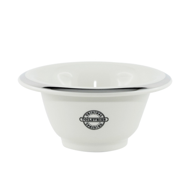 Ciotola in porcellana Original Toileteries per montare il sapone da barba, bordo argentato. La base della ciotola ha una bombatura centrale che consente al pennello di incorporare l’aria durante il montaggio. Disponibile in avorio e nero.
